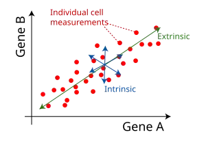 Los niveles de ruido intrínseco y extrínseco a menudo se comparan en estudios de reporteros duales, en los que los niveles de expresión de dos genes regulados de manera idéntica (a menudo reporteros fluorescentes como GFP e YFP) se trazan para cada célula de una población.[7]