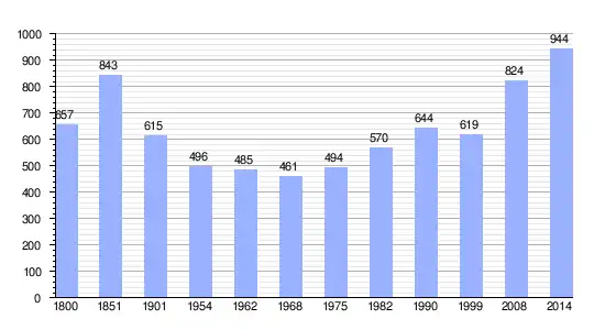 Los datos demográficos contemplados en este gráfico de la comuna de Ruillé-le-Gravelais[4] se han cogido de 1800 a 1999 de la página francesa EHESS/Cassini, y los demás datos de la página del INSEE.[5]