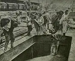 La situación bélica internacional perjudicó al país incluso habiéndose mantenido neutral.[120] Con escasa industria, tenía que importar el armamento necesario para equipar al ejército, que se preparaba para una futura intervención en la contienda.[120] La guerra supuso además problemas para el transporte de las cruciales exportaciones agrícolas,[121] la movilización de parte del campesinado y la incautación estatal de animales y alimentos, consecuencias todas ellas negativas para los labradores.[120] El cierre otomano de los estrechos del mar Negro desbarató el comercio rumano, puesto que el 80 % de las exportaciones del país se realizaban a través de ellos en 1914.[122][121] La complicación de enviar los productos a Europa occidental hizo que creciese el comercio con las naciones centroeuropeas, en especial con Austria-Hungría, que suministraba el 60 % de las importaciones rumanas y adquiría alrededor del 20 % de sus exportaciones.[122] Entre 1914 y 1916, las exportaciones a Alemania pasaron de suponer el 23 % del total al 29,4 % y las realizadas a Austria-Hungría crecieron del 18,5 % al 47,9 %.[122] El grueso de lo vendido en el extranjero consistía en petróleo y cereales.[122][116] La venta de estos últimos, principalmente a Bélgica y al Reino Unido, había comenzado en el siglo XIX con la organización de grandes latifundios dedicados a la producción y exportación de grano.[121] Al comienzo, el Gobierno rumano se había resistido a vender a Alemania el grano que ya no podía exportar a la Europa occidental, pero las victorias de los imperios en la zona en 1915 hicieron que cambiase de actitud.[121]
