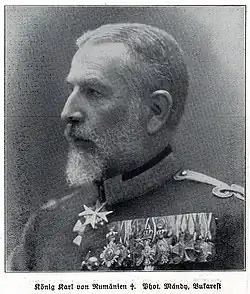 En el reino de Rumania regía una dinastía de la Casa de Hohenzollern desde 1866.[35][33][63][36][41][nota 4] El rey de Rumania, Carol I de Hohenzollern,[35][63] había firmado un tratado secreto[35][64] con Alemania y el Imperio austrohúngaro,[nota 5] conocido como Triple Alianza, en 1883[67][33][37] que disponía que el país se comprometía a ir a la guerra solamente en el caso de que el Imperio austrohúngaro fuese atacado.[68][69][70][71][41][65][72] Por su parte, los austrohúngaros se obligaban a defender Rumania de cualquier ataque ruso o serbio.[35] La alianza, conveniente para los rumanos que temían las ambiciones rusas[63] y otomanas, se había renovado en 1892 y 1913.[33][73][66][41][65][74] La hostilidad de la opinión pública hacia el Imperio austrohúngaro impidió, sin embargo, que el pacto se debatiese públicamente o se sometiese a ratificación en el Parlamento.[75][72] El soberano lo comunicaba confidencialmente a cada nuevo presidente del Gobierno, que se comprometía a guardar el secreto.[65] Desde enero de 1914, el Gobierno lo ostentaba el partido liberal, cuyos miembros habían estudiado en general en Francia y a los que se tenía por favorables a la Entente.[76] Fue entonces cuando el rey informó al nuevo presidente Gobierno Ion Brătianu de la existencia de la liga secreta y su reciente renovación, en febrero de 1913.[72]