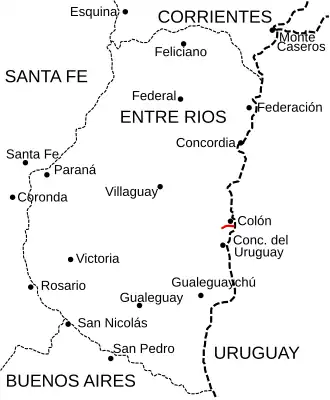 | • oeste | RN 14 cerca de Colón (32°15′39.7″S 58°14′17.9″O / -32.261028, -58.238306) | ||||||||