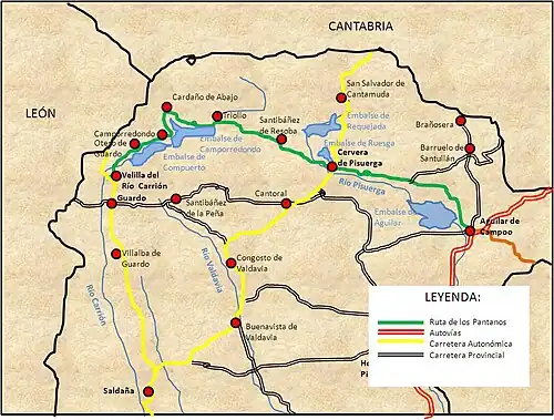 Atraviesa los embalses de esta comarca: en la vertiente del río Pisuerga, el Ruesga y de Requejada y en la vertiente del río Carrión: embalses de Camporredondo y Compuerto. Como complemento —aunque no se encuentra en la ruta— se puede visitar el pantano de Aguilar, también en el cauce del Pisuerga.