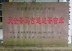 | Almacén oficial de té de Bian | Condado de Tianquan | 30°01′14.8″N 102°49′47.9″E / 30.020778, 102.829972 |