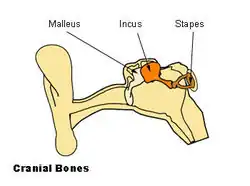 ![]() Osiculos auditorios, cuya fusión es un síntoma de esta afección. | ||