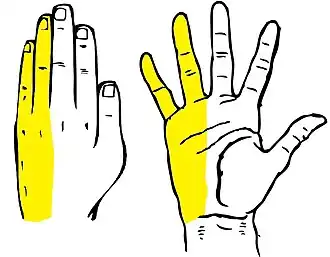 ![]() Distribución sensitiva del nervio cubital en la mano. El dolor u hormigueo suele percibirse en esta zona. | ||