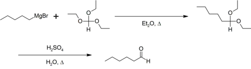 La reacción del reactivo de Grignard con ortoformiato de trietilo da como producto un acetal, que puede ser hidrolizado a un aldehído. Por ejemplo, la síntesis de n-hexaldehído.[1]