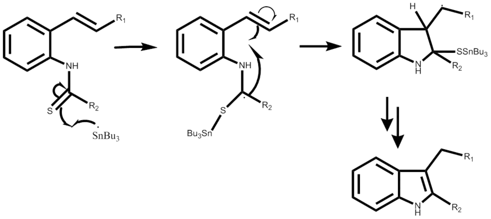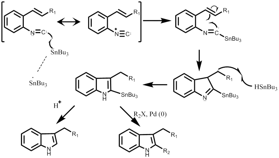 El mecanismo de reacción comienza con la creación del radical tributil estaño con AIBN o trietilborano, que no se muestra en ningún mecanismo por etapas. Después de los ataques radicales, el carbono o-isocianico crea el radical alfa-estannoimidoilo. Mediante la ciclación radical se forma un anillo de cinco miembros seguido de la propagación de un nuevo radical estaño. El paso final depende del resultado deseado de la reacción. Esta reacción es una síntesis de un recipiente y produce rendimientos que varían del 50% al 98%, dependiendo del sustituyente.[5]
