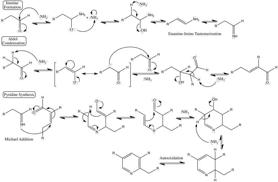 - ↑ Jie Jack Li (2009). «Chichibabin pyridine synthesis». Name Reactions. pp. 107–109. ISBN 3540402039. doi:10.1007/978-3-642-01053-8_51.