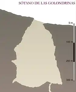 Durante mucho tiempo el Sótano de Golondrinas fue considerada la caverna de un solo tiro más grande del mundo con sus 512 metros de profundidad, 376 m de ellos en una caída libre.