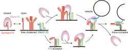 - ↑ Shi L, Kümmel D, Coleman J, Melia TJ, Giraudo CG (November 2011). «Dual roles of Munc18-1 rely on distinct binding modes of the central cavity with Stx1A and SNARE complex.». Molecular Biology of the Cell 22 (21): 4150-60. PMID 21900493. doi:10.1091/mbc.e11-02-0150.