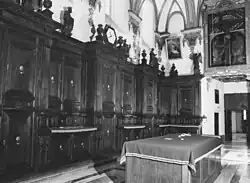 La parte inferior del espacio se encuentra guarnecida de ricas cajonerías de nogal macizo, profusamente decoradas e incluyendo estatuas de los doce apóstoles decoradas con tintes broncíneos.