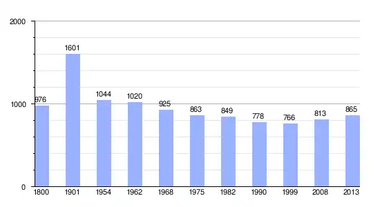 Los datos demográficos contemplados en este gráfico de la comuna de Saint-Cyprien-sur-Dourdou[4] se han cogido de 1800 a 1999 de la página francesa EHESS/Cassini, y los demás datos de la página del INSEE.[5]