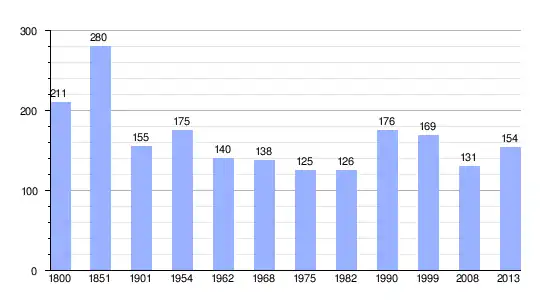 Los datos demográficos contemplados en este gráfico de la comuna de Saint-Martin-le-Hébert[4] se han cogido de 1800 a 1999 de la página francesa EHESS/Cassini, y los demás datos de la página del INSEE.[5]