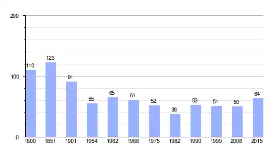 Los datos demográficos contemplados en este gráfico de la comuna de Saint-Romain-sur-Gironde[4] se han cogido de 1800 a 1999 de la página francesa EHESS/Cassini, y los demás datos de la página del INSEE.[5]