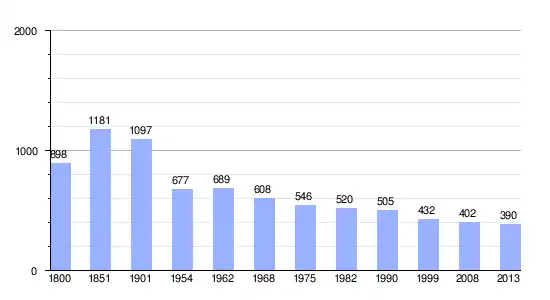 Los datos demográficos contemplados en este gráfico de la comuna de Saint-Salvadou[4] se han cogido de 1800 a 1999 de la página francesa EHESS/Cassini, y los demás datos de la página del INSEE.[5]