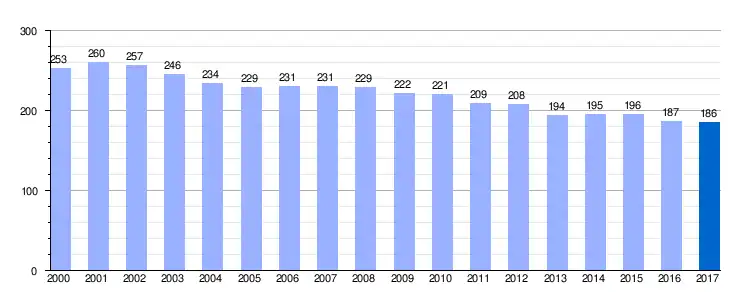 | Gráfica de evolución demográfica de Salas de la Ribera entre 2000 y 2017 |