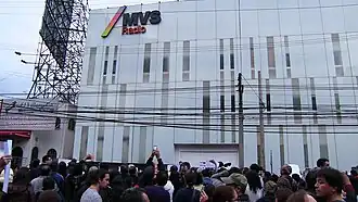 ![]() Manifestantes fuera de las oficinas de MVS Radio en la Ciudad de México el 16 de marzo de 2015. | ||
