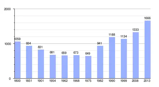 Los datos demográficos contemplados en este gráfico de la comuna de Salignac[4] se han cogido de 1800 a 1999 de la página francesa EHESS/Cassini, y los demás datos de la página del INSEE.[5]