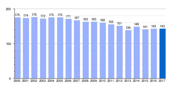 | Gráfica de evolución demográfica de Salinas de Añana[6] entre 2000 y 2017 |