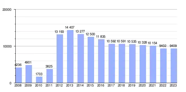 | Gráfica de evolución demográfica de Salobreña[14] entre 1842 y 2021 |