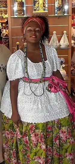 Bahiana vestida de manera típica, en negocio de Salvador de Bahía.