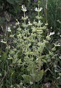 Es una planta perenne herbácea con una corola de color blanco y nuececillas ovadas. Florece en mayo y fructifica desde junio en adelante. Aunque la planta es similar a Salvia spinosa, se diferencia en que tiene hojas más estrechas y tiene menos cálices fructíferos espinosos, y posee un tubo de la corola más largo.[1]