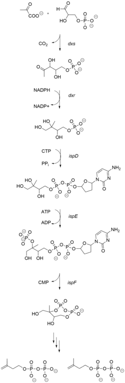- ↑ Kutrzeba L, Dayan FE, Howell J, Feng J, Giner JL, Zjawiony JK (July 2007). «Biosynthesis of salvinorin A proceeds via the deoxyxylulose phosphate pathway». Phytochemistry 68 (14): 1872-1881. PMC 2065853. PMID 17574635. doi:10.1016/j.phytochem.2007.04.034.