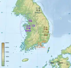 La ubicación exacta de los tres proto-reinos se ha disputado, dando la posibilidad de que las fronteras hayan cambiado con el transcurso del tiempo. El libro clásico coreano Samguk Sagi localiza a Mahan en la región norte de la actual Corea del Sur que luego Goguryeo ocuparía, Jinhan cerca de Silla, y Byeonhan al suroeste de Baekje. Sin embargo, el libro chino San guo zhi que se escribió antes de Samguk Sagi ubica a Mahan en la región suroeste, Jinhan al sur-este y Byeonhan entre los dos reinos.