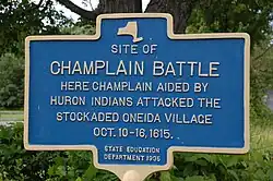El 29 de julio, en algún lugar de la zona cercano a Ticonderoga y Crown Point (estado de Nueva York) (los historiadores no están seguros de cuál de estos dos lugares, pero Fort Ticonderoga reclama que se produjo cerca de su sitio), Champlain y su equipo encontraron a un grupo de iroqueses. Al día siguiente, doscientos iroqueses avanzaban sobre su posición. Un guía indígena señaló a los tres jefes iroqueses: Champlain inmediatamente mató a dos de ellos a la vez con un solo disparo de arcabuz, que también provocó la rápida huida de todos los iroqueses. Esta acción dio comienzo a un largo período de relaciones hostiles entre la confederación de las cinco naciones iroquesas contra los colonos franceses, que durara el resto de siglo.[26]