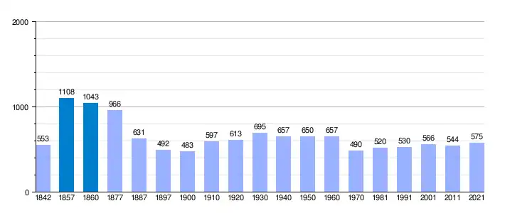 | Gráfica de evolución demográfica de San Baudilio de Llusanés[7] entre 1842 y 2021 |