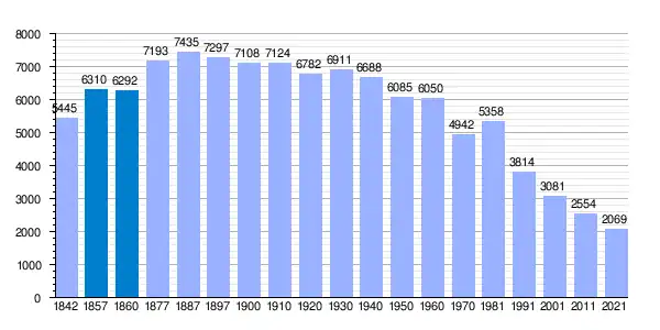 | Gráfica de evolución demográfica de San Cristovo de Cea[6] entre 1842 y 2021 |