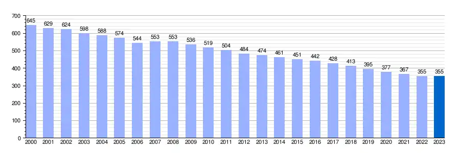 | Gráfica de evolución demográfica de San Felices de los Gallegos[31] entre 2000 y 2023 |