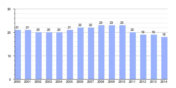 | Gráfica de evolución demográfica de San Justo de las Regueras[2] entre 2000 y 2014 |