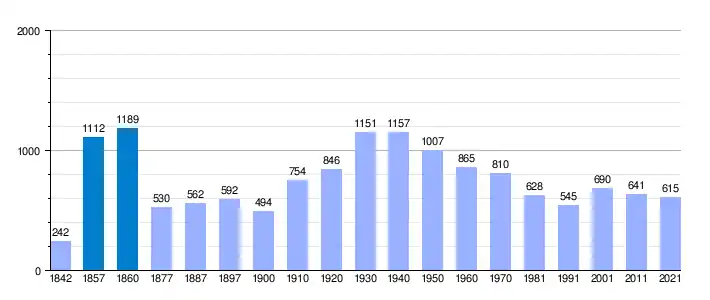 | Gráfica de evolución demográfica de San Mateo de Bages[3] entre 1842 y 2021 |