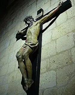 Dentro de la iglesia se encuentra un cristo de madera policromada, de tamaño natural realizado por Gregorio Fernandez, representativa del arte de la escuela castellana de escultura. El estudio anatómico realista busca expresar con la mayor fidelidad posible la realidad del Crucificado, y provocar así un mayor sentimiento de piedad en quien lo contempla.