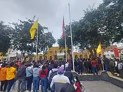 ![]() ![]() Vista parcial de la plaza Mayor con el palacio Municipal al fondo y vista frontal del palacio Unanue.