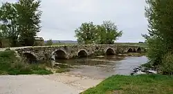 e) Puente medieval conocido como «de las Bodegas» y «Romano». Tiene seis ojos y dos tajamares. No tiene pretil y la plataforma mide 46 m de largo y, según tramos, entre 2,15 y 2,80 m de ancho.[22]