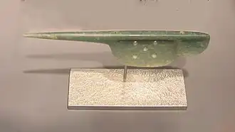 - ↑ Este artefacto en particular, en el Snite Museum of Art, está etiquetado como "sangriento". Gillett Griffin se hace eco de esto, afirmando que la cuchara "probablemente tenía una función ritual en la sangría o en la absorción de alucinógenos con fines rituales." (Griffin, p. 219). Sin embargo, hay cierto desacuerdo en esta atribución: Justin Kerr, por ejemplo, identifica tentativamente implementos mayas similares como "versiones simbólicas de jade" de un tintero de escriba (véase "Where Do You Wear Your Paint-Pot?".