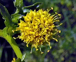 Hierba perenne que crece de una gruesa raíz principal que se asemeja a un nabo. La planta es principalmente erguida, con un crecimiento de hasta medio metro de altura. Las hojas miden hasta 10 centímetros de largo y se divide en varios lóbulos con dientes afilados. La inflorescencia está formada por una o más cabezas bisexuales y una única masculina con flores pequeñas, curvadas, con pétalos de color amarillo oro. Los frutos espinosos son de aproximadamente medio centímetro de largo.