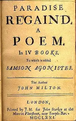 - ↑ Milton, John (1671). Paradise Regained; A Poem in IV Books; To Which is Added Samson Agonistes (II edición). London: John Starkey at the Mittre in Fleetstreet, near Temple Bar. Consultado el 8 de enero de 2017.