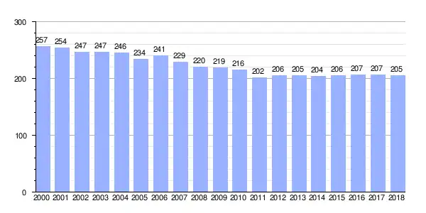 | Gráfica de evolución demográfica de Mellid[3] entre 2000 y 2018 |