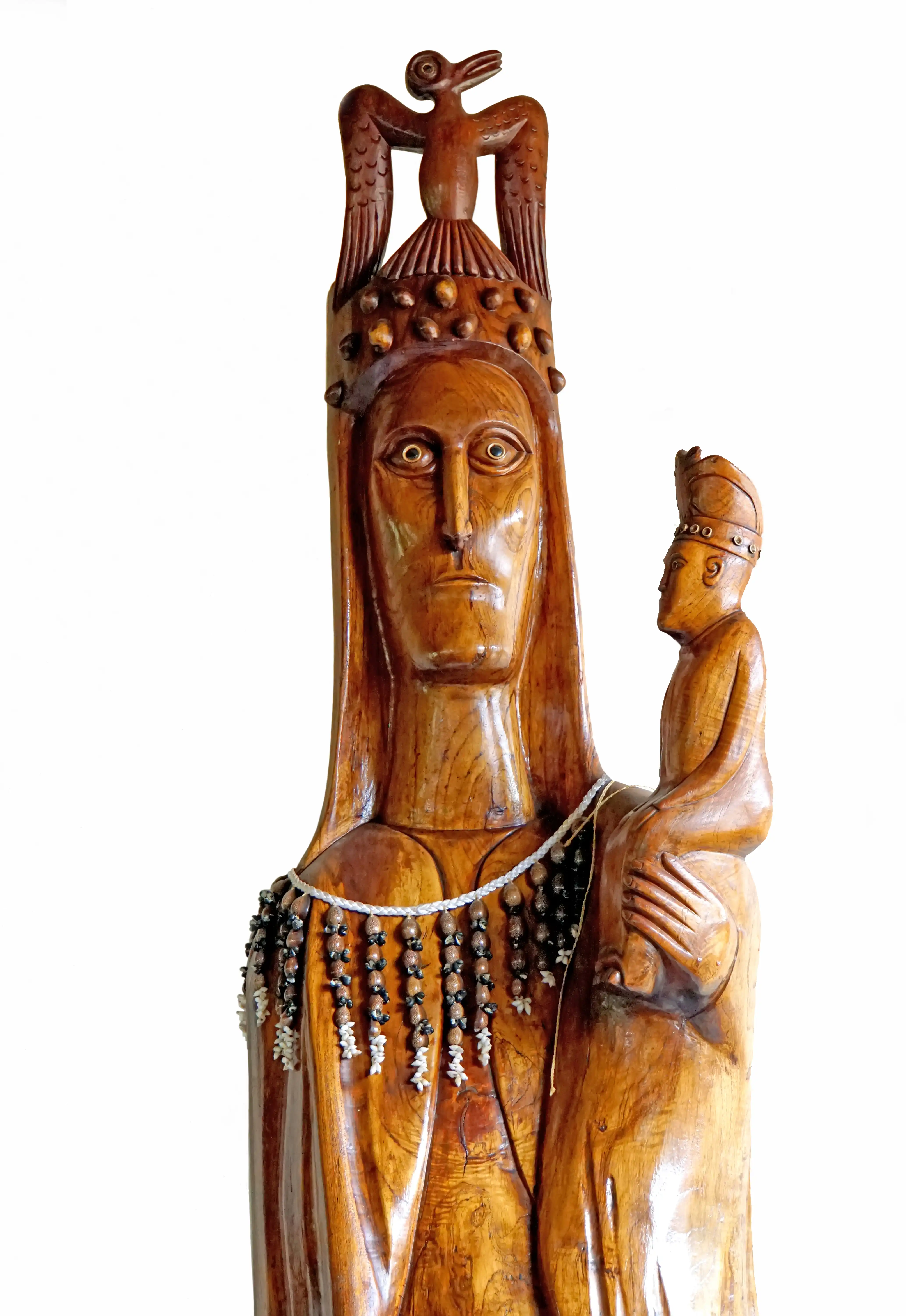 La imagen de Santa María de Rapa Nui fue tallada en un tronco de miro Tahití. Su postura y proporciones imita a los moái y su rostro a Make-Make suprema divinidad de los pascuenses. Los pliegues del manto parecen alas y en su cabeza lleva una corona de conchas rematada por la figura de un ave manutara. La imagen lleva al Niño Jesús en su brazo izquierdo. Sus ojos están confeccionados con concha de pez con pupilas de obsidiana, proyectando todo su mana o poder espiritual sobre el pueblo polinesio de Rapa Nui. La Virgen, pues representa el sincretismo religioso entre las creencias ancestrales de la isla y la Iglesia católica, llevada por los europeos.