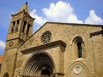 Se accede al templo mediante dos portadas románicas, abiertas en el muro septentrional y al poniente, respectivamente. La de poniente es uno de los mejores ejemplos de la escuela de Lérida, por la riqueza de su decoración. Construida a mediados del siglo XIII está formada por ocho arquivoltas en degradación, que descansan sobre dieciséis columnas a cada lado, y que constituyen un cuerpo sobresaliendo de la fachada. Cada una de las arquivoltas está decorada con motivos diferentes, de tipo geométrico, con arquerías entrelazadas, o con figuras humanas. Los capiteles destacan por su ornamentación vegetal. El fuste y el basamento de las columnas han sido restaurados recientemente por la Generalidad de Cataluña. Uno de los elementos más significativos es el grupo esculpido en alto relieve, situado en las dovelas centrales de la puerta, y que representan la Virgen con el Niño, flanqueada a la izquierda con la Anunciación ya la derecha con la Adoración los reyes.[2] Una inscripción recuerda que fueron los tejedores de la ciudad los que sufragaron la colocación de este grupo, en 1283. Es una obra de transición, de concepción todavía románica, pero con mayor realismo.[3]