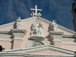 Al sur de la izquierda, adosada a su pared izquierda, se levanta el una torre campanario rectangular de seis pisos (originalmente cinco); el sexto piso se incorporó durante última reconstrucción de la iglesia, dotando la linterna con una pequeña y una cúpula. La torre presenta una ornamentación sencilla, aunque notable, con las mismas pilastras en forma de contrafuertes en las esquinas de todos los niveles, y las ventanas de arco de medio punto con verjas decorativas.[3] El diseño de la campana principal, expuesta en el campanario del quinto piso, también exhibe una forma decorativa, mientras que la campana del sexto piso es más pequeña y sencilla.