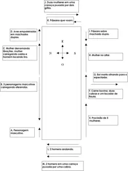 De igual forma que en la cara norte, el fondo también se divide en superficies pintadas con colores blancos, amarillos y oscuros: de izquierda a derecha, vemos que las imágenes se representan sobre amarillo, blanco, azul y blanco nuevamente.[25]