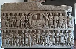 La parte frontal está dividida en dos registros, según la costumbre de la época, con historias del Antiguo y del Nuevo Testamento y un clípeo central con forma de concha, dentro del cual se encuentra el retrato de dos difuntos abrazados que llevan vestidos matrimoniales, típicos del siglo IV (túnica, dalmática y toga contabulata para él, que tiene en la mano un rótulo y túnica y palio para ella, que lleva trenzas). Las cabezas apenas están esbozadas y atestiguan así cómo no dio tiempo o voluntad de personalizar el sarcófago.