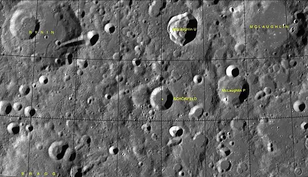 Schönfeld es un cráter de impacto que se encuentra justo más allá del terminador noroeste de la Luna, en la cara oculta respecto a la Tierra. Esta parte de la superficie puede a veces quedar a la vista durante períodos de libración e iluminación favorables, aunque no se puede discernir mucho detalle. Este cráter está situado al norte de Avicenna y de la enorme llanura amurallada del cráter Lorentz. Al noroeste se halla el cráter Rynin y al noreste aparece McLaughlin.