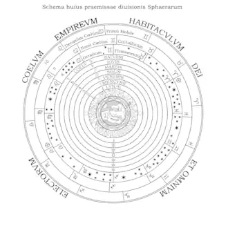 En su cosmografía, deudora de los modelos renacentistas de Cristóbal Clavio y Gerolamo Cardano (entre otros),[38] Diaz hace uso del modelo de las esferas aristotélicas, pero aceptando el postulado de la excepcionalidad del origen divino de tierra sobre la superficie acuática para, a continuación, defender la existencia de un único cuerpo compuesto por ambos elementos (el globo terráqueo) y dudar de la existencia de una esfera de fuego; a la vez que el domínico segmenta los cielos en tres partes: cielo aéreo, escenario de los fenómenos meteorológicos (todos aquellos fenómenos atmosféricos que hoy son estudiados por la meteorología); firmamento, objeto de estudio de la ciencia moderna en materia de cosmografía (los cuerpos celestes, los sistemas cosmológicos, el calendario, etc.); y cielo empíreo, dedicado a las verdades de la religión (la naturaleza divina, la relación de Dios con la humanidad, los ángeles, la traición de Luzbel a Dios y el castigo que obtuvo junto a sus secuaces, la visión beatífica, etc.).[39] Mismo modelo del cielo tendrían pensadores coetáneos como Manuel Lacunza en su Venida del Mesías en Gloria y Majestad. Este cambalache entre la tradición medieval de cuño aristotélico-tomista y la tradición renacentista vuelven a este texto el fiel representante de un período de eclecticismo y desintegración del escolasticismo colonial.[40]