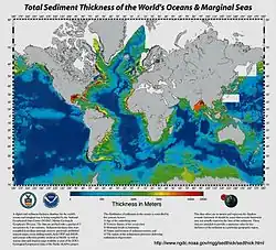 Los sedimentos se acumulan de forma distinta según las regiones oceánicas. La mayor parte de los sedimentos marinos se encuentran en las laderas continentales (41%), con grosor promedio de 9 km. En segundo lugar están las subidas continentales, que concentran el 31% de los sedimentos y con un grosor promedio de 8 km. En tercer lugar aparecen las plataformas continentales (15% de los sedimentos, 2,5 km de grosor) y en cuarto lugar el suelo oceánico profundo (78% de los sedimentos, 0,6 km de grosor). [1][2]