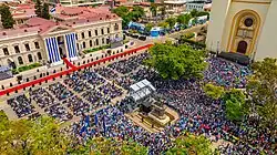 Asimismo, en la Plaza Gerardo Barrios se contó con la presencia de altos funcionarios de los Órganos Ejecutivo, Judicial y del Ministerio Público, del Cuerpo Diplomático acreditado en El Salvador, representantes de organismos internacionales, autoridades de la Fuerza Armada y cuerpo de seguridad pública, empresarios, líderes religiosos y otras personalidades destacadas.[6][7][8]